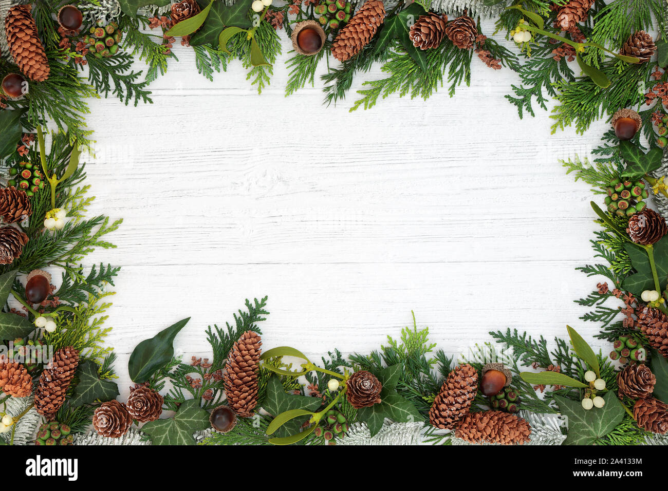 Green tree branches with pine cones frame on stylish white rustic wooden background.